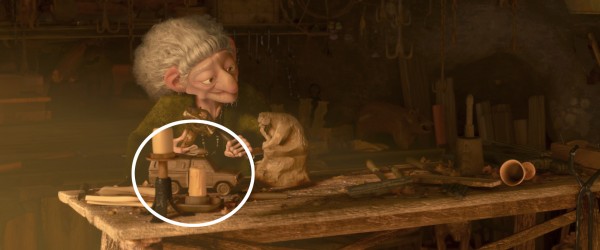 ANCIENT DELIVERY – The Witch, an eccentric crone disguised as a woodcarver specializing in whittling wooden bear figurines and conjuring haphazard spells, showcases her mysterious and inexplicable knowledge of the future with a carved figurine of the infamous Pizza Planet truck, an iconic delivery vehicle that’s appeared in nearly every full-length feature film from Pixar Animation Studios since 1995’s Toy Story. Disney•Pixar’s Brave is in theaters now.